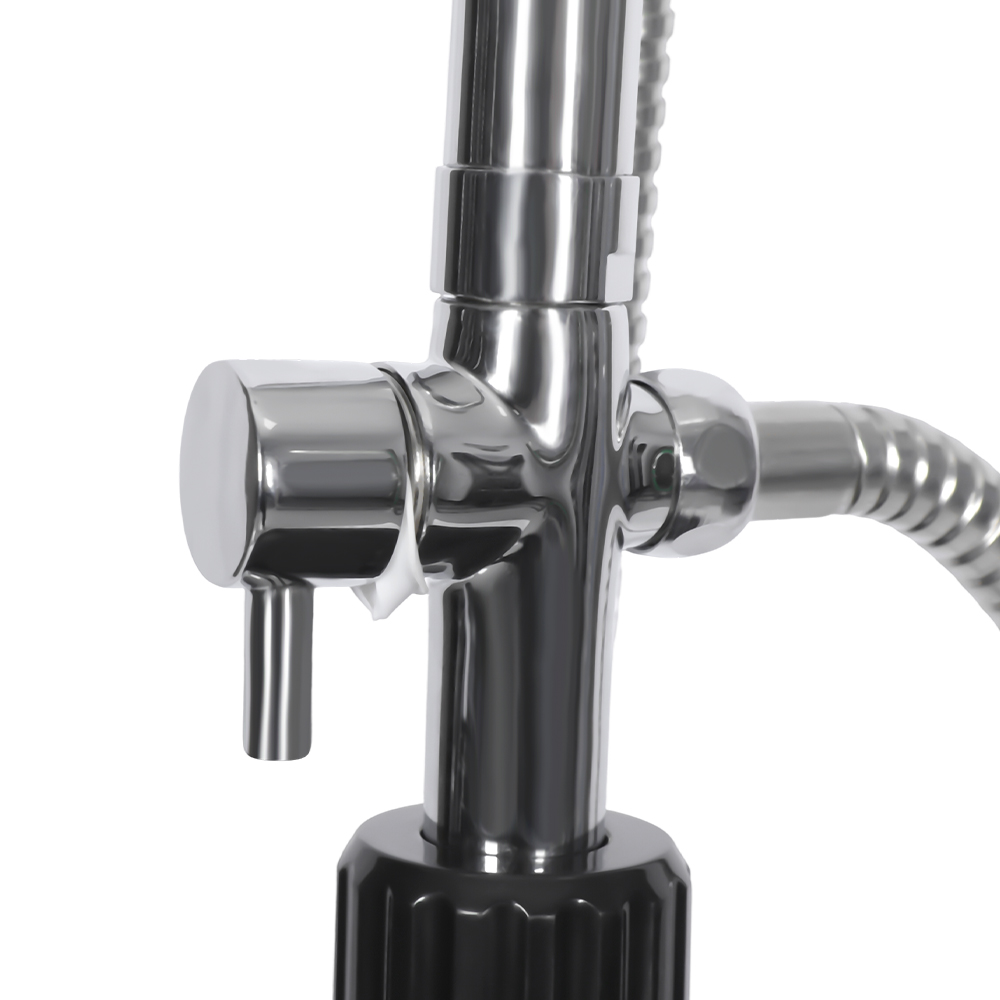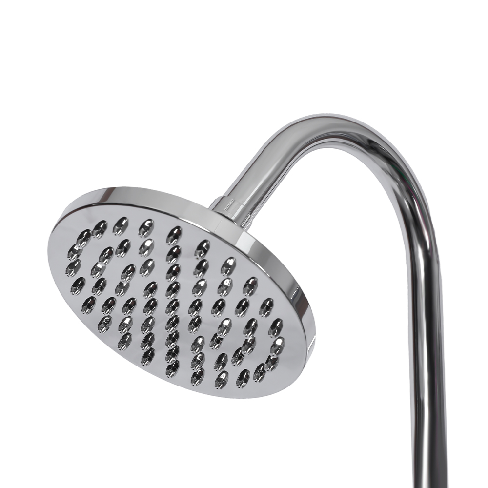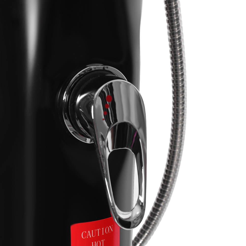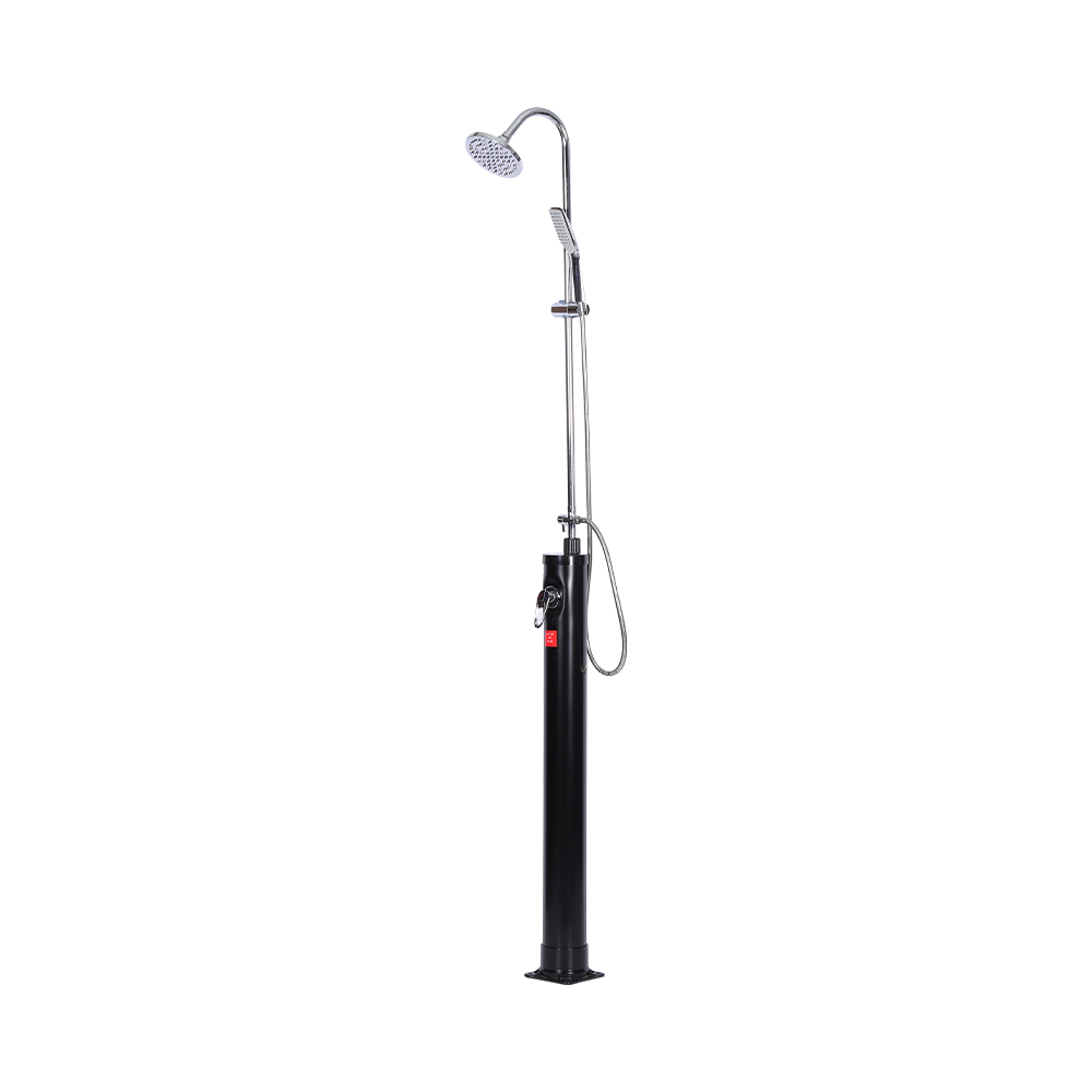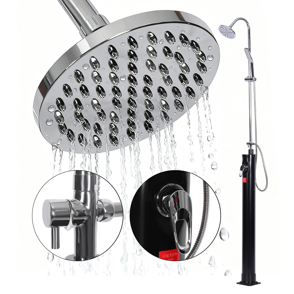 LY08L03 8L utendørs hagebasseng solsøyledusj har en ettgreps blandebatteri som nøyaktig regulerer vanntemperaturen ved å blande varmt vann fra dusjrøret med kaldt vann fra en hageslange. Den er utstyrt med en hageslangetilkobling for praktisk fylling og en dreneringsplugg som tillater fullstendig vannavløp for sikker vinteroppbevaring. Bygget på en solid base i rustfritt stål for stabilitet, er dusjens individuelle deler sikkert festet med skruer, og den må forankres til bakken for sikker bruk. Bruksanvisning er inkludert og tilgjengelig på flere språk.